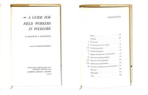 Book Condition, Very Good with some slight age related tanning to Page Edges, DJ is rubbed with sunned Spine and some small abrasions, a small tear (2mm) and age related yellowing (see photos). A Guide for Field Workers in Folklore. KENNETHS . GOLDSTEINP. Preface by HAMISH HENDERSON, Pennsylvania: Folklore Associates, Inc., 1964. xviii, 199 pp., bibliography, index. One of the great voids in the study of folklore has been filled. While folklorists, like other field workers, publish the results of their field work, they rarely deal with the mechanics of how the data was collected, except perhaps for a few human-interest incidental anecdotes. Each new generation of folklorists is sent out into the field where they make many of the same mistakes made by their predecessors, bolstered with the knowledge that experience is not only the best teacher but the only one. One consequence is that the quality of folklore collection has not improved materially in the last several decades. The author of this excellent field manual would be the last to say that there is any\nsubstitute for actual experience in the field. But this guide is designed to make that experience a much richer one. Chapters on problem formulation, pre-field preparations, the establishment of rapport with informants, observation collecting methods, interview collecting methods, and the techniques of motivating informants (including the sometimes ticklish devices of plying them with either small amounts of money or large amounts of liquor) spell out the nature of field workin terms which most professionals will find similar to their own experience but which they have never formally articulated for themselves or for their students. Although the guide is specifically intended for folklorists, it can be read with profit by any social scientist going into the field. Goldstein's delineation of three kinds of folklore data reveals his praiseworthy ethnographic bias. In addition to the usual materials of folklore, he indicates that folklore processes (e.g., context) and folklore ideas (e.g., the informant's attitudes and esthetic principles) must be collected by the expert folklorist. General methodological statements, however, are reinforced with many concrete suggestions often based upon the author's own field work in Scotland and the eastern United States. Itemized lists such as the one on What to Observe" in the collecting context (pp. 91-93) or a checklist of data to be sought when eliciting an informant's personal life history (pp. 126- 127) should prove useful to professional and amateur alike. To those who may object that common sense cannot be codified