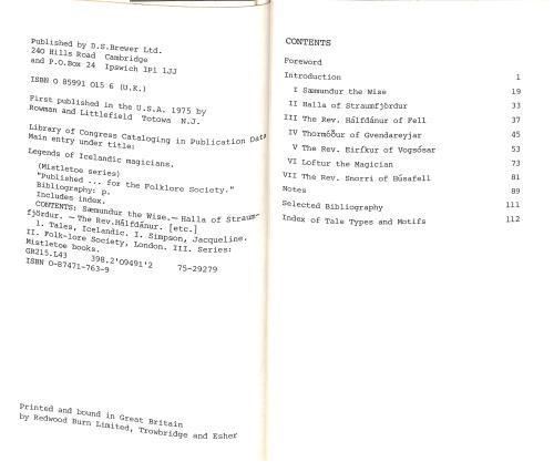 D. S. Brewer/Rowman & Littlefield for the Folklore Society. Ipswich, 1975. First Edition. Green cloth, gilt. 120pp including notes, bibliography and index. Slight speckling to Page Edges and some age related tanning to End papers. Otherwise, clean, clear text in tightly bound volume. DJ in very good condition with minimal evidence of shelf wear and handling. On or two small (2mm or less) tears at Top of DJ , Spine of DJ sunned a little. Cambridge. With classified indexes to tale types and motifs. Simpson's excellent translations of Icelandic folktakes offer to anthropologists an easily accessible source which preserves the structure and terms of the original text as much as possible. Not only are these tales presented in perfectly readable English, but Simpson has taken care to see that her rendition is grammatically parallel to the Icelandic texts. This is no easy task as is made apparent in the quality of theท translation by Benedik ( I Loftur the Magician') which is included in this selection. Together with Simpson's book, Icelandic Folktales and Legends .(1973), these translations of Icelandic folktales are easily the most reliable that have yet appeared. The majority of the pieces are taken from Jon Arnason's collection of tales about individual magicians (einstakir galdramenn). although two tales are from Olafur Davisson'sท(1945) and three were contributed by Benedikz.; The contents of the manuscript which were told to him in the 1930's. Thus we are presented with a record of 200 years of tales about these magicians, the majority of whom lived in the sixteenth and seventeenth centuries, although the greatest of them all,\nSmundur the Wise, lived from 1056-1133. Simpson has translated Jon Arnason's notes and the sources he cited for the tales, supplementing these notes with her own comments on the motifs which appear. Her notes provide an excellent guide to further readings on the subject, both in English and in Icelandic.