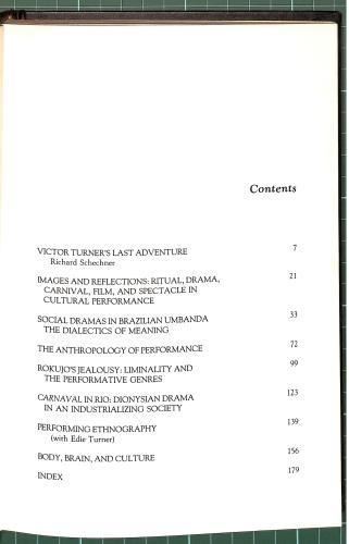Book Condition: Very Good with no DJ. Black Boards Gilt Title on Spine. First Edition. Slight tropical speckling to top Page Edge only, otherwise, clean, clear text in tightly bound volume. No internal inscriptions, markings or stains. Dimensions: 23.2 x 16.7 x 2.8 cm. Weight: 717 g. In this posthumous collection, Turner continues his quest for 'a liberated anthropology,' a cause helped in part by the recent postmodern consciousness." -- American Theatre. Victor W. Turner (b. 1920–d. 1983) was a symbolic anthropologist whose comparative investigations of ritual and cultural performance left a unique impression in the social and human sciences, and across the arts. Turner became a prolific contributor to the comparative anthropology of ritual, symbol, and performance and had a prodigious impact across a spectrum of disciplines, from anthropology, religious and theological studies, to cultural, literary, and performance studies, to folklore, literary criticism, and neurosociology. As found in key monographs and numerous essays, his influential formulations on the ontological value of ritual symbolism, “liminality,” and culture were shaped by a lifelong passion for poetry, the classics, and stage drama. While Turner made a path beyond the Manchester School and Neo-Marxist analysis, he modified a structural-functionalist perspective in an abiding interest in universals in human performance and the fate of religion in postindustrial culture. A departure from social structure toward meaning coincided with a move to the United States, where Turner accepted an appointment as Professor of Anthropology and Chairman of the Committee on African Studies at Cornell University in Ithaca, New York (1964–1968), holding professorships in anthropology in the United States thereafter. It was during his life in the United States that Turner cut his teeth as an iconoclastic essayist and skillful orator ranging widely across disciplines. While Turner’s ethnographic career began in Africa formulating his “social drama” model, subsequent investigations included Christian pilgrimage in Mexico and Ireland (as a practicing Catholic), Japanese literary and performative genres, New York’s experimental Off-Off Broadway theater workshops, and the Carnaval in Rio. These and many other postindustrial performance genres or “cultural dramas” were understood via his “processual analysis,” which became integral to the formation of Performance Studies. While attracting controversy for expressing universalisms and his theological position, Turner’s ideas have retained appeal in the study of contemporary cultural performance. There are no book-length biographies on Turner, presumably, in part, because his endeavor was uniquely interdisciplinary, anti-systematic, and perplexing—even mystical. A fatal heart attack on 18 December 1983 cut short a very productive scholarly life, but at least we have his books.