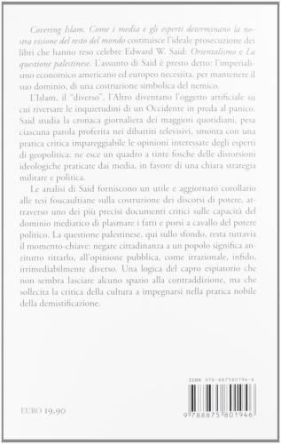 Book Condition: Near Fine. Dimensions: 8.3 x 5.5 x 0.8 inches. Weight: 12 ounces. Covering Islam. Come i media e gli esperti determinano la nostra visione del resto del mondo costituisce l’ideale prosecuzione dei libri che hanno reso celebre Edward W. Said: Orientalismo e La questione palestinese. L’assunto di Said è presto detto: l’imperialismo economico americano ed europeo necessita, per mantenere il suo dominio, di una costruzione simbolica del nemico. L’Islam, il diverso, l’Altro diventano l’oggetto artificiale su cui riversare le inquietudini di un Occidente in preda al panico. Said studia la cronaca giornaliera dei maggiori quotidiani, pesa ciascuna parola proferita nei dibattiti televisivi, smonta con una pratica critica impareggiabile le opinioni interessate degli esperti di geopolitica: ne esce un quadro a tinte fosche delle distorsioni ideologiche praticate dai media, in favore di una chiara strategia militare e politica. Le analisi di Said forniscono un utile e aggiornato corollario alle tesi foucaultiane sulla costruzione dei discorsi di potere, attraverso uno dei più precisi documenti critici sulle capacità del dominio mediatico di plasmare i fatti e porsi a cavallo del potere politico. La questione palestinese, qui sullo sfondo, resta tuttavia il momento-chiave: negare cittadinanza a un popolo significa anzitutto ritrarlo, all’opinione pubblica, come irrazionale, infido, irrimediabilmente diverso. Una logica del capro espiatorio che non sembra lasciare alcuno spazio alla contraddizione, ma che sollecita la critica della cultura a impegnarsi nella pratica nobile della demistificazione. Perché l’Islam è spesso riconducibile in modo pavloviano a un’intera serie di eventi politici, culturali, sociali e perfino economici? Cosa c’è nell’Islam che provoca una reazione così immediata e irrefrenabile? Cosa rende differente l’Islam e il mondo islamico dall’Occidente, anzi, dal resto del Terzo mondo e, durante la Guerra fredda, anche dall’Unione Sovietica? CITAZIONI: Ogniqualvolta romanzieri, reporter, strateghi-politici ed “esperti” trattano l’Islam, vale a dire l’Islam che è attualmente in vigore in Iran e in altre parti del mondo musulmano, pare che non vi possano essere distinzioni tra il fervore religioso e la lotta per una giusta causa, tra la normale debolezza umana e il conflitto politico; il corso della storia fatta da uomini, donne e società non è contemplato come un umano divenire. L’Islam sembra fagocitare i variegati aspetti del mondo musulmano, tutti riconducibili in una speciale entità malvagia, priva di ragione. Ogni volta che un musulmano si pronuncia sull ’Occidente, o un americano sull’ Islam, inevitabilmente entrano in gioco enormi generalizzazioni che, sebbene rendano possibile forme di scambio, allo stesso tempo ne impediscono altre. Le definizioni sono ideologiche, cariche di forti emozioni e, rimanendo intatte nel corso dei secoli, sono state capaci di adattarsi al mutare degli eventi e delle situazioni.